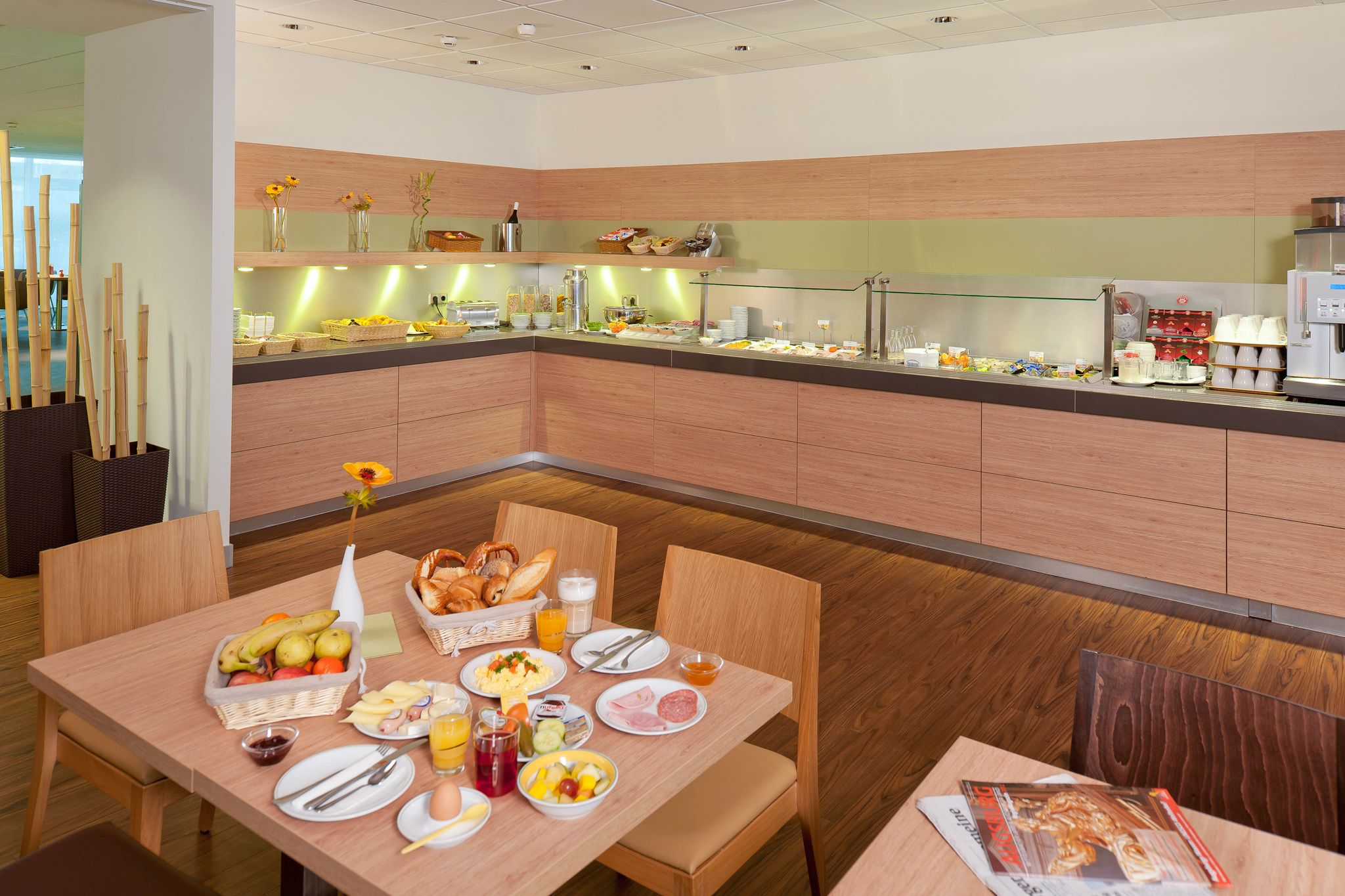 Bedienen Sie sich morgens im ibis Augsburg Hauptbahnhof nach Herzenslust am Frühstücksbuffet. Wer möchte, kann sich hier selbst Waffeln backen.