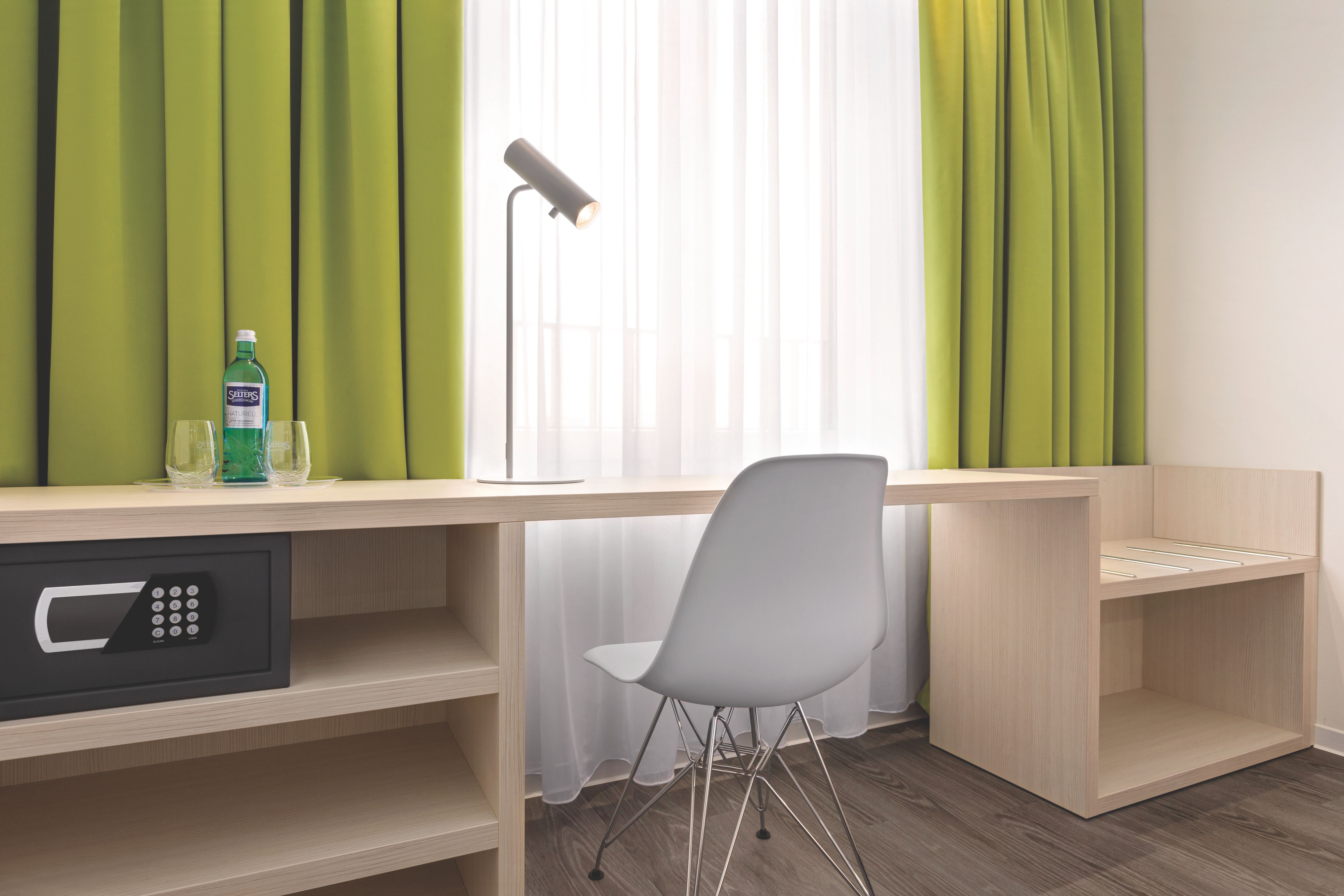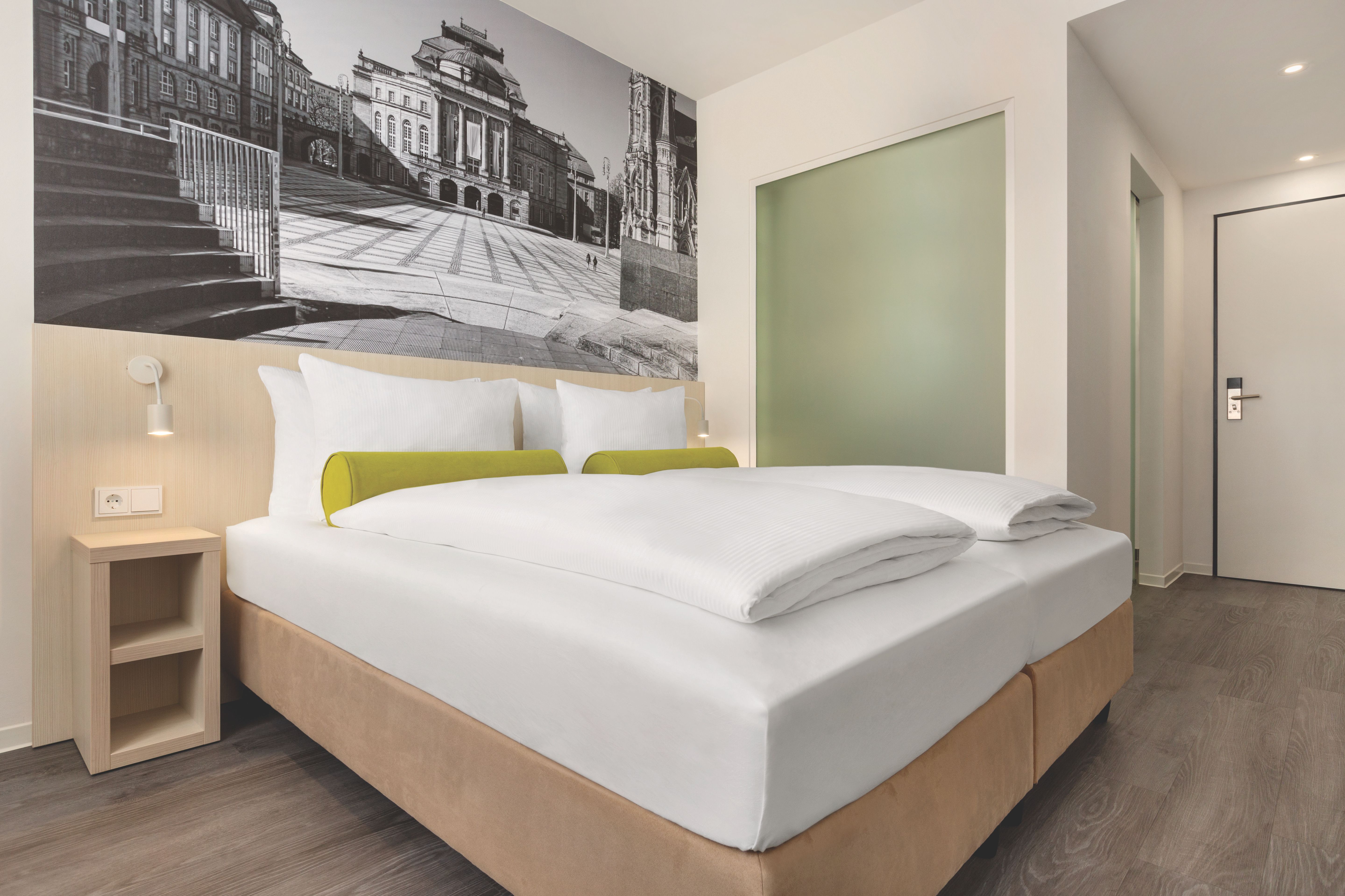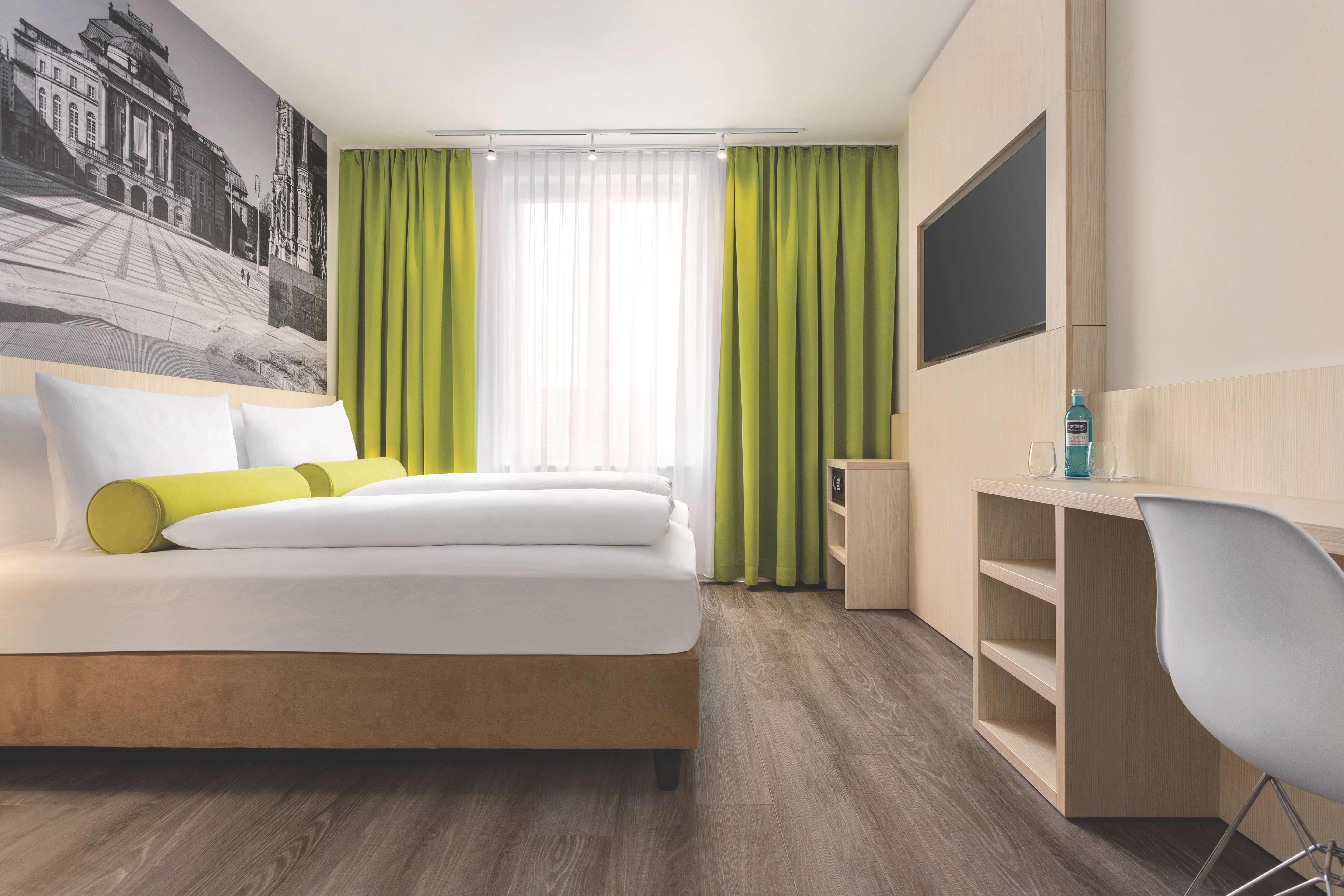 Grün ist die Farbe der Hoffnung. Im Chemnitz Hotel musst Du allerdings nicht hoffen, sondern kannst Dir sicher sein, dass Du in den Zimmern Entspannung nach einem erlebnis- oder arbeitsreichen Tag in und rund um Chemnitz findest. Wir haben grüne Akzente gesetzt, große Fototapeten von unserer Stadt aufgehängt und das Zimmer zusätzlich mit einem Schreibtisch ausgestattet. Natürlich direkt am Fenster – so kannst Du wahlweise mit Tages- oder Kunstlicht arbeiten, die Vorhänge auflassen oder zuziehen.